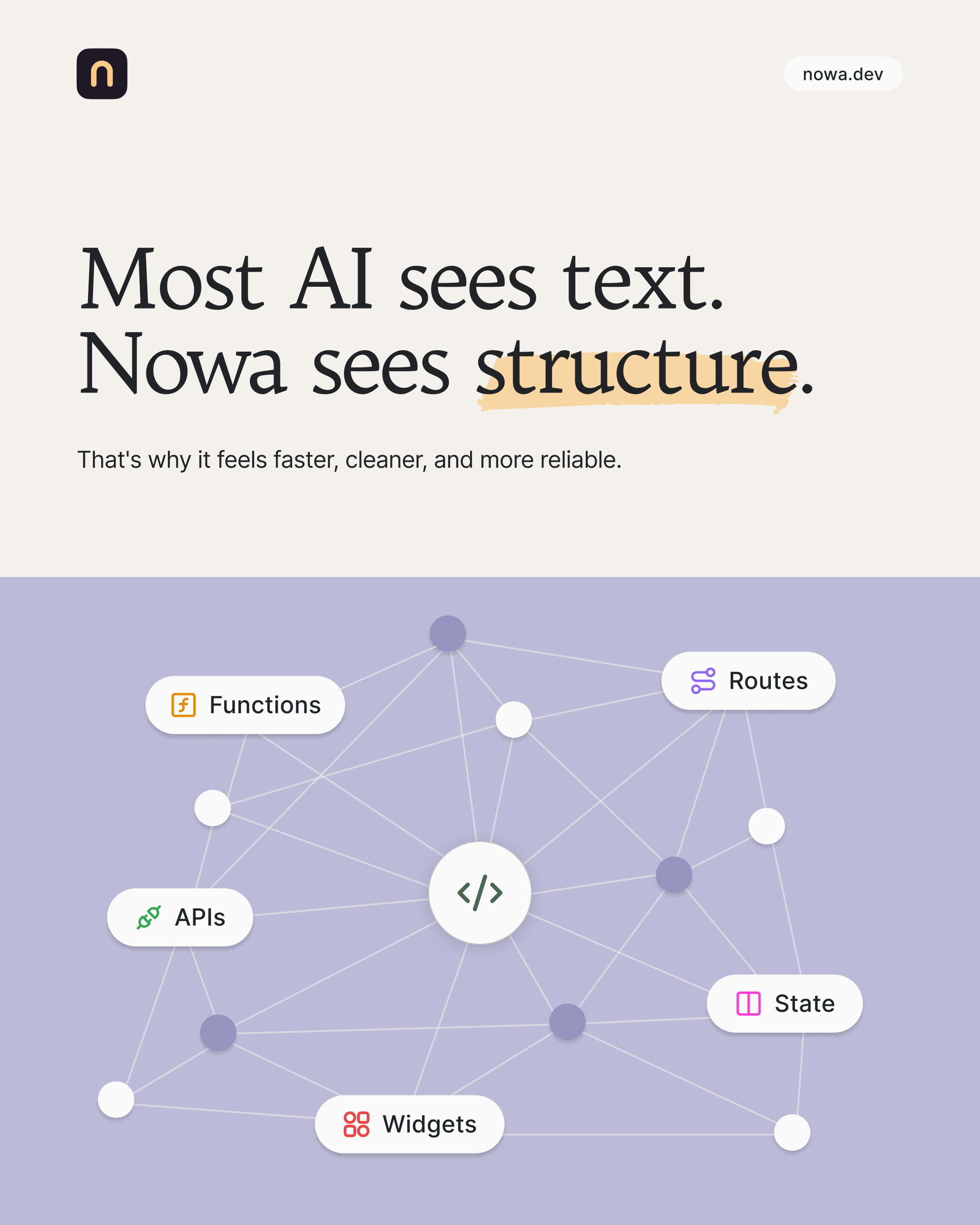 - The AI only writes part of the code. Nowa auto-generates the rest, structure, boilerplate, all the scaffolding. So prompts aren’t just more efficient, they’re safer too, since key decisions like structure are made by the platform, not the AI.